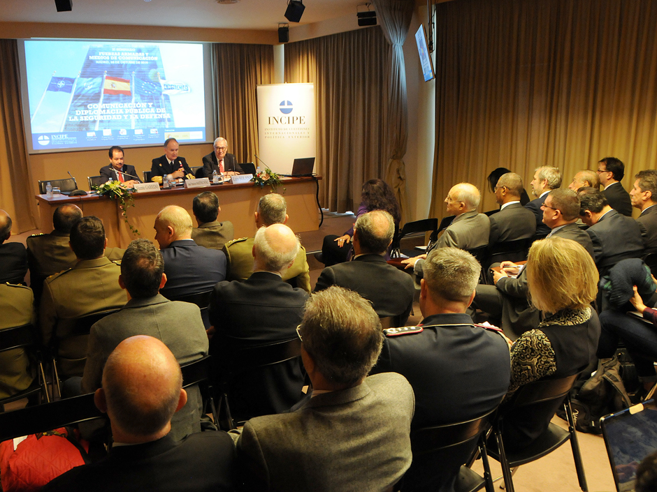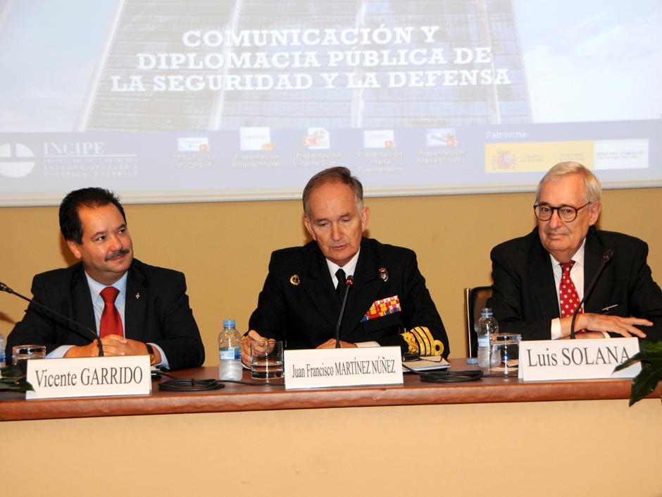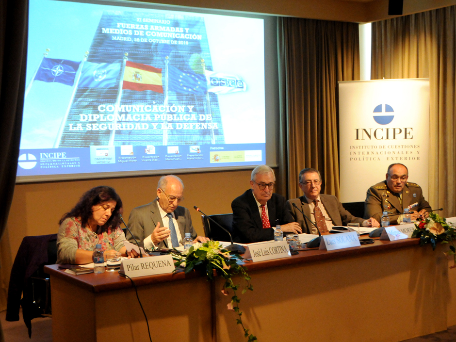 El primer panel del Seminario, bajo el título de Estrategias de comunicación de la seguridad y la defensa contó con la participación de Miguel Morer, Jefe de Prensa de la Oficina de Comunicación del Gabinete del Ministro de Defensa; el Coronel Dionisio Urteaga, Jefe de la Sección de Influencia y Comunicación del Mando de Operaciones del EMAD; José Luis Cortina, Presidente del Grupo Atenea y Pilar Requena, periodista de TVE y profesora de Relaciones Internacionales en la IE University.