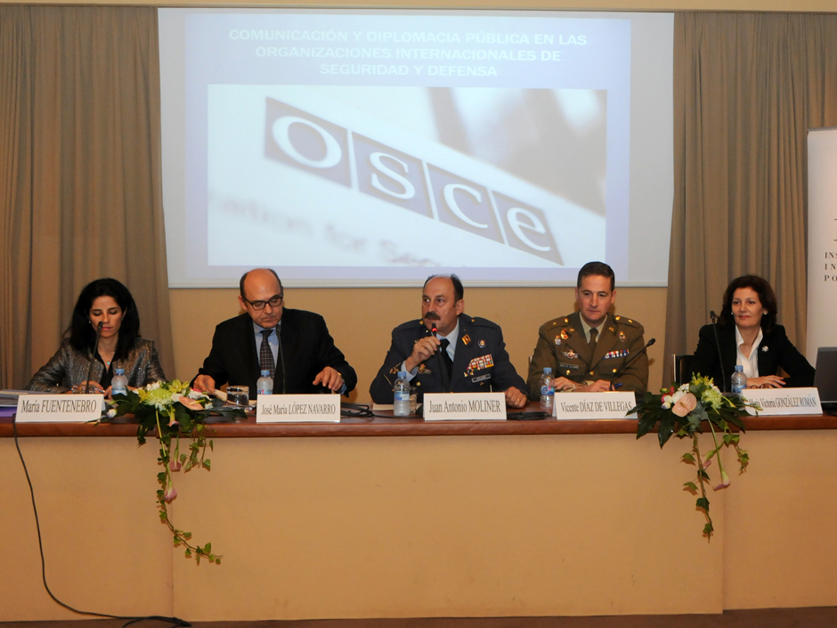 El segundo panel del Seminario tuvo como título Comunicación y diplomacia pública en las Organizaciones Internacionales de Seguridad y Defensa, que contó con el General de División Juan Antonio Moliner, actual Director del Gabinete Técnico del SEGENPOL como moderador. Conformaron la mesa como conferenciantes María Victoria González Román, Embajadora Representante Permanente de España ante la OSCE; José María López Navarro, Oficial de Información de la División de Diplomacia Pública de la OTAN; María Fuentenebro, Ex Oficial de Coordinación Cívico-Militar para la OCHA-ONU y el Comandante Vicente Díaz de Villegas, Ex responsable de las Operaciones de Información, Crisis Response/Current Operations del Estado Mayor de la Unión Europea.