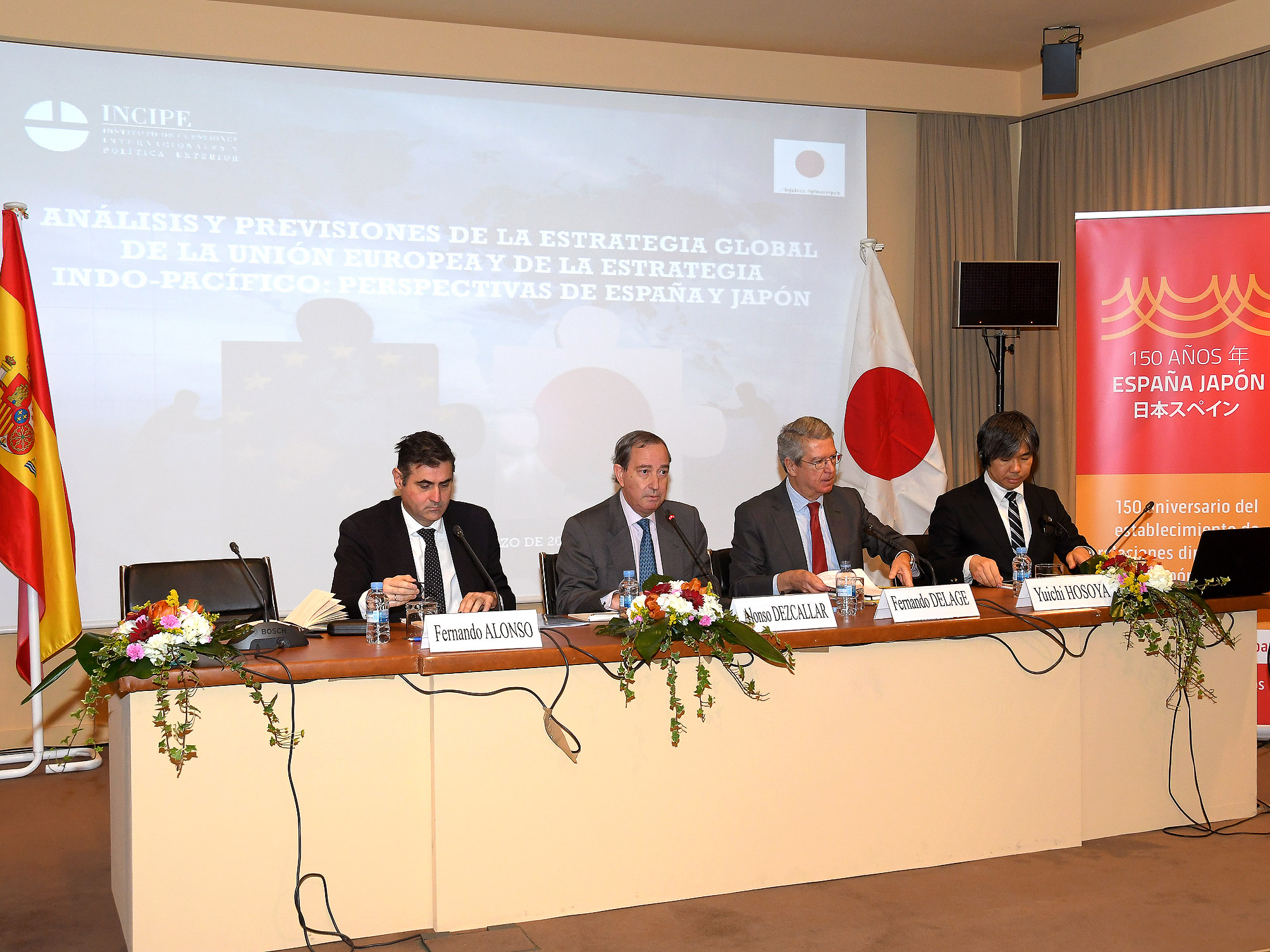 La primera mesa, bajo el título La estrategia Global del a UE: ¿cómo fortalecer la diplomacia económica y el papel de la UE en la seguridad en Asia?, contó con la ponencia de David Navarro, Director de Casa Asia, Íñigo Febrel, Subdirector General de Diplomacia Económica (Ministerio de Asuntos Exteriores y de Cooperación), Alfonso Jiménez, Jefe de Área de Japón en la Subdirección General Política Comercial con Europa, Asia y Oceanía, y Ana Gascón, Profesora de Derecho Internacional Público y miembro de Grupo de Investigación sobre Japón, Universidad de Zaragoza. Todos ellos moderados por José Pedro Sebastián de Erice, Secretario General de INCIPE.
