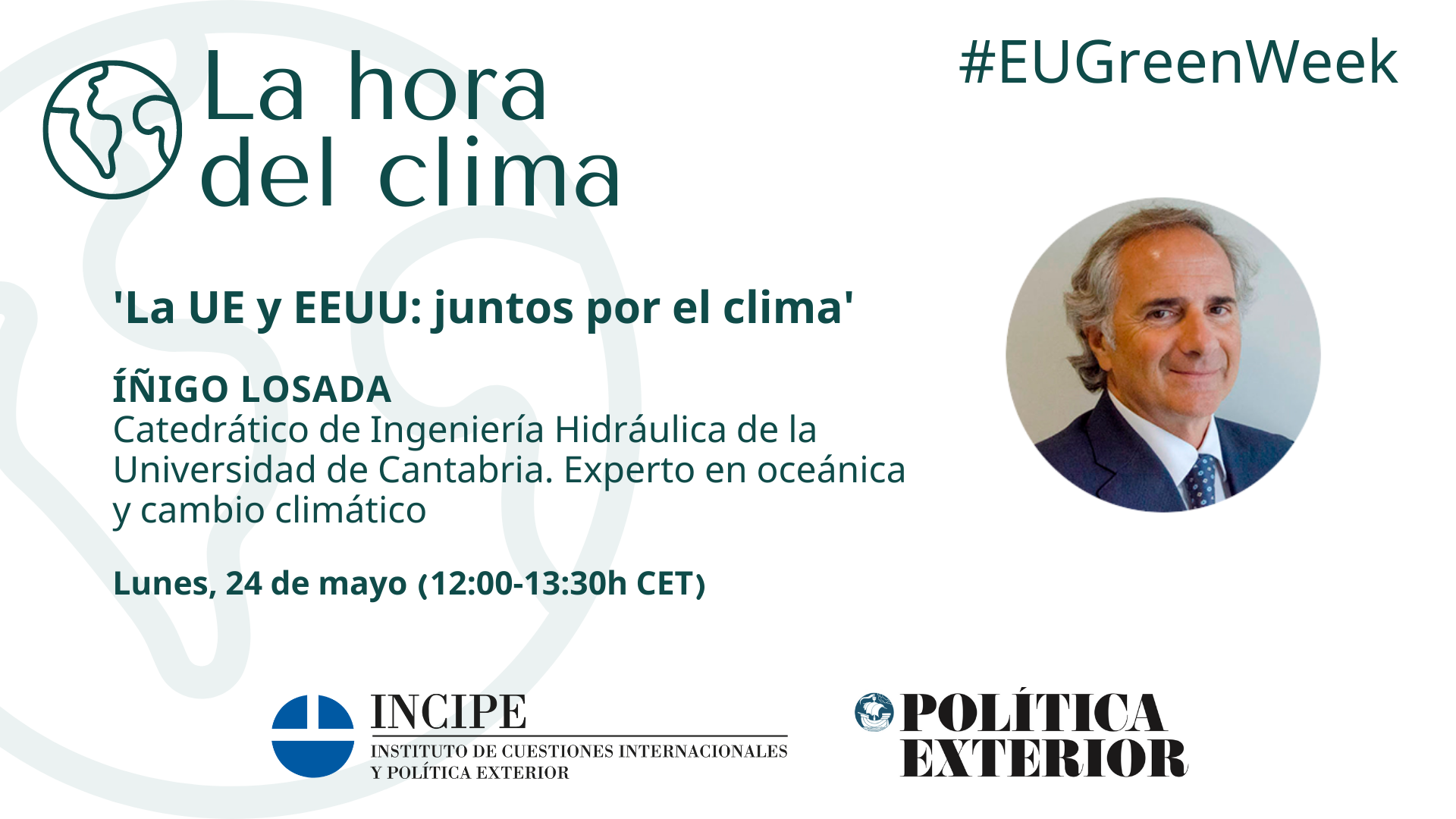 El 24 de mayo tuvo lugar el II encuentro digital del ciclo La hora del clima organizado por INCIPE y Estudios de Política Exterior. La sesión, titulada La UE y EEUU: juntos por el clima ha contado con la participación de Iñigo Losada, catedrático de la Universidad de Cantabria, director de investigación del Instituto de Hidráulica Ambiental y experto en oceánica y cambio climático. Tras la ponencia tuvo lugar una ronda de preguntas moderadas por Joaquín Pérez de Ayala, colaborador de INCIPE. El evento fue presentado por Manuel Alabart, secretario general de INCIPE y embajador de España, y clausurado por Aurea Molto, directora de Política Exterior.