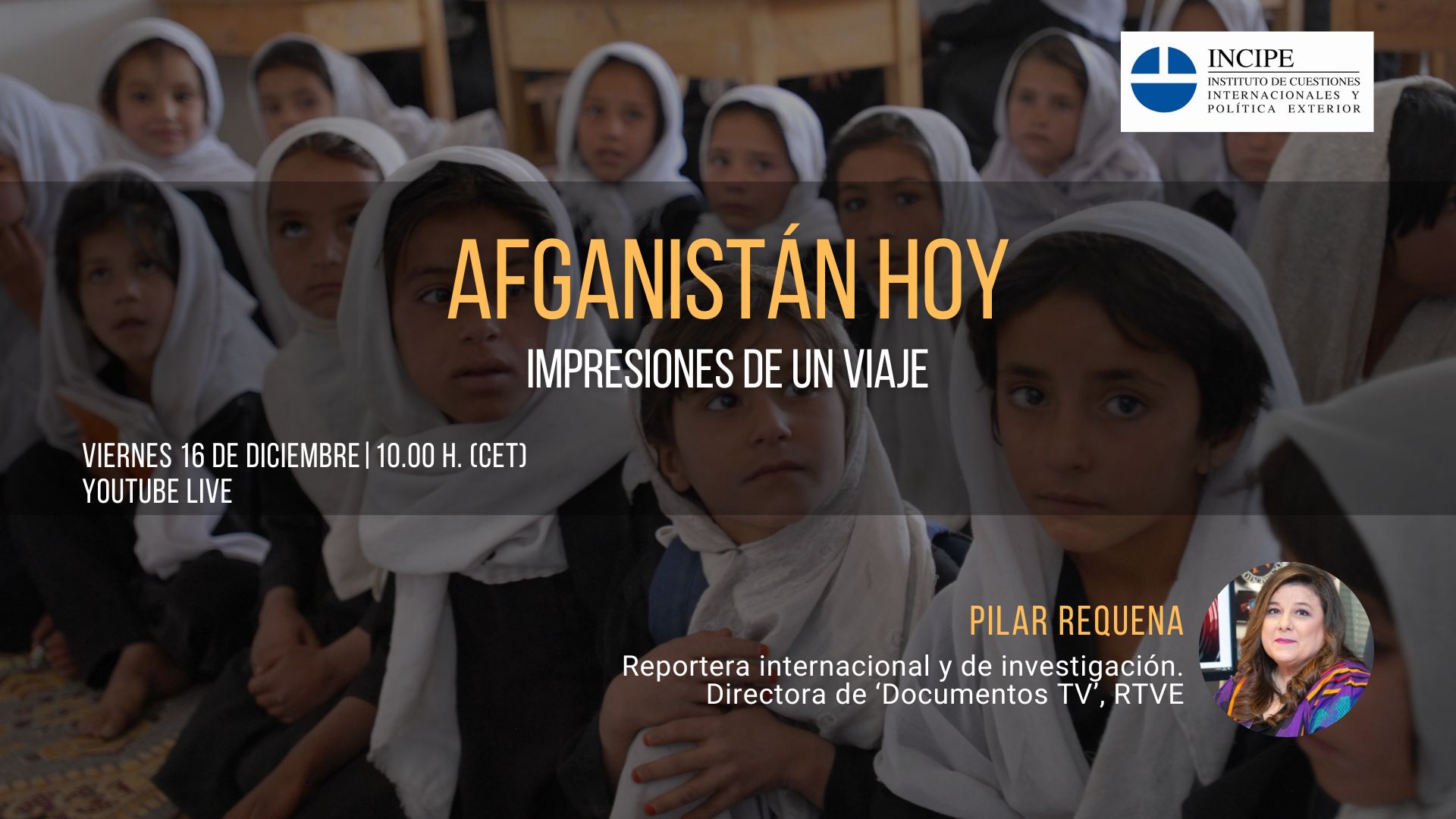 El 16 de diciembre de 2022 INCIPE celebró un nuevo encuentro digital titulado Afganistán hoy: Impresiones de un Viaje, en el que participó como ponente Pilar Requena, reportera internacional y de investigación y directora de “Documentos TV” (RTVE). El evento fue presentado por el secretario general de INCIPE y embajador de España, Manuel Alabart. Tras la ponencia, se celebró una ronda de preguntas moderada por el director de INCIPE, Vicente Garrido, en el que se trataron cuestiones como: el papel de Pakistán en la política talibán; el grado de control talibán de las provincias de influencia iraní, tayika o uzbeka; el grado de cumplimiento de los acuerdos de Doha; las posibilidades de una revolución cívica de la sociedad o la penetración china en el país en términos comerciales y de asesores.