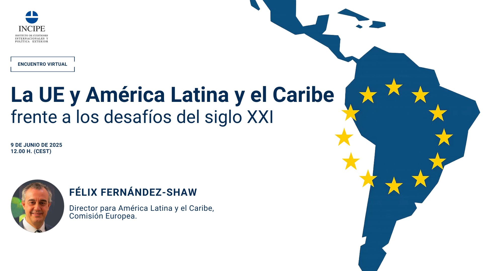 El pasado 9 de junio de 2025, INCIPE celebró una sesión virtual titulada “La UE y América Latina y el Caribe frente a los desafíos del siglo XXI”. La ponencia corrió a cargo de Félix Fernández-Shaw, diplomático de carrera y actual director para América Latina y el Caribe en la Comisión Europea. La sesión fue presentada por Ricardo Díez-Hochleitner, secretario general de INCIPE, y, tras la intervención del ponente, se abrió una ronda de preguntas moderada por el director general de la Fundación, Vicente Garrido.